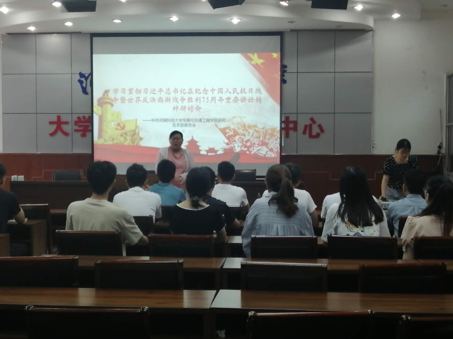 2020年9月10日上午,车辆学院研究生党支部组织全体党员在6号楼101举办了学习贯彻习近平总书记在纪念中国人民抗日战争暨世界反法西斯战争胜利75周年重要讲话精神研讨会,本次会议由车辆学院研究生党支部书记王运玲同志主持,全体党员参加会议。