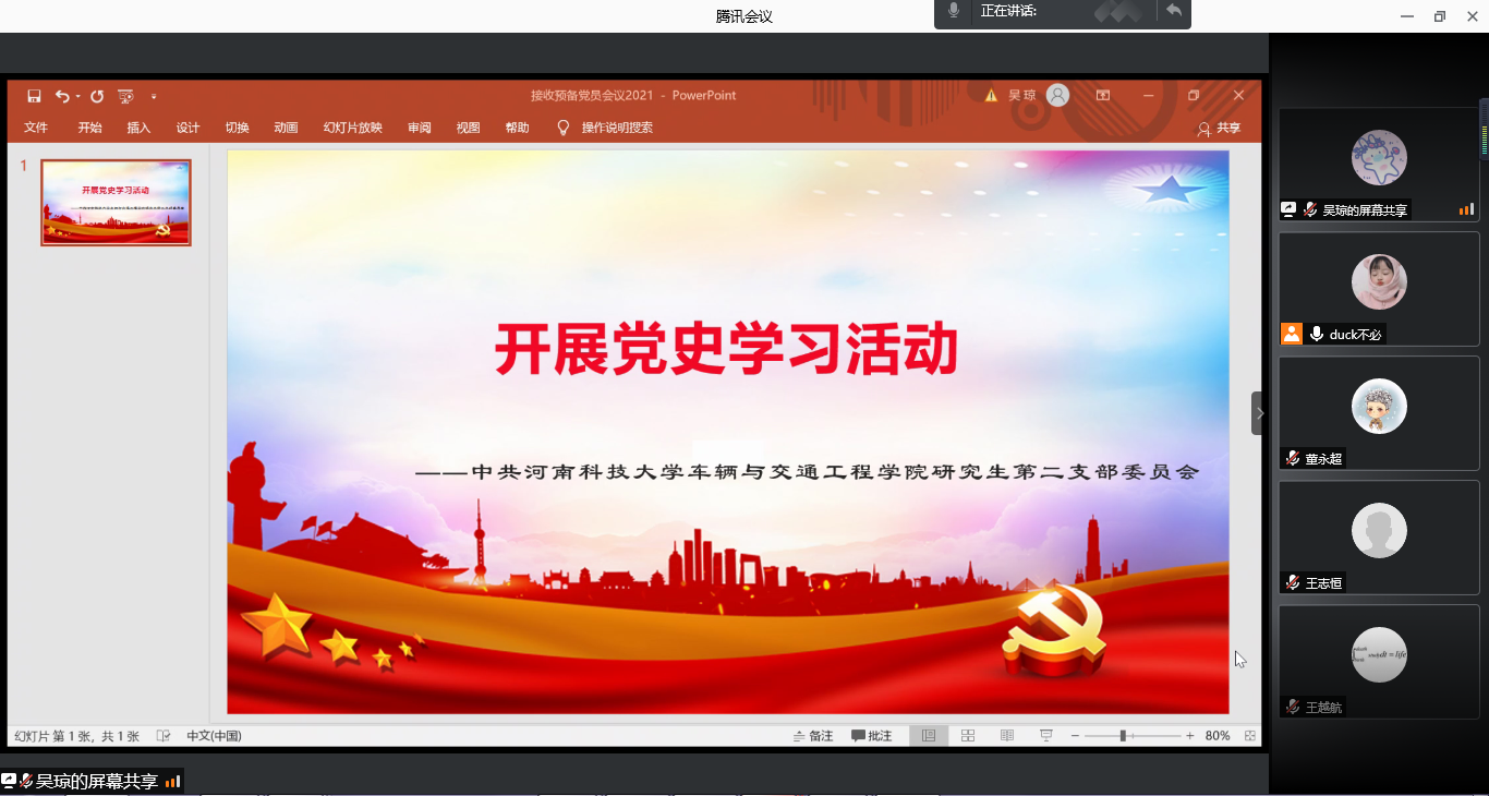 首先,支部书记王运玲组织大家集中收看重温党史视频。接着,为大家讲解了中国共产党简史。会议中,王运玲同志向与会人员提出明确要求:一是广大党员要提高政治站位,深刻领会党史学习教育的重大意义,把党史学习教育实施好,确保取得扎实成效;二是各党员同志要将专业优势和党史学习教育相结合,引导更多同学积极参与进来,实现深入学习,及时传达;三是要把党史学习教育融入日常工作和生活中,充分运用各类思政元素、红色资源,提升政治水平。