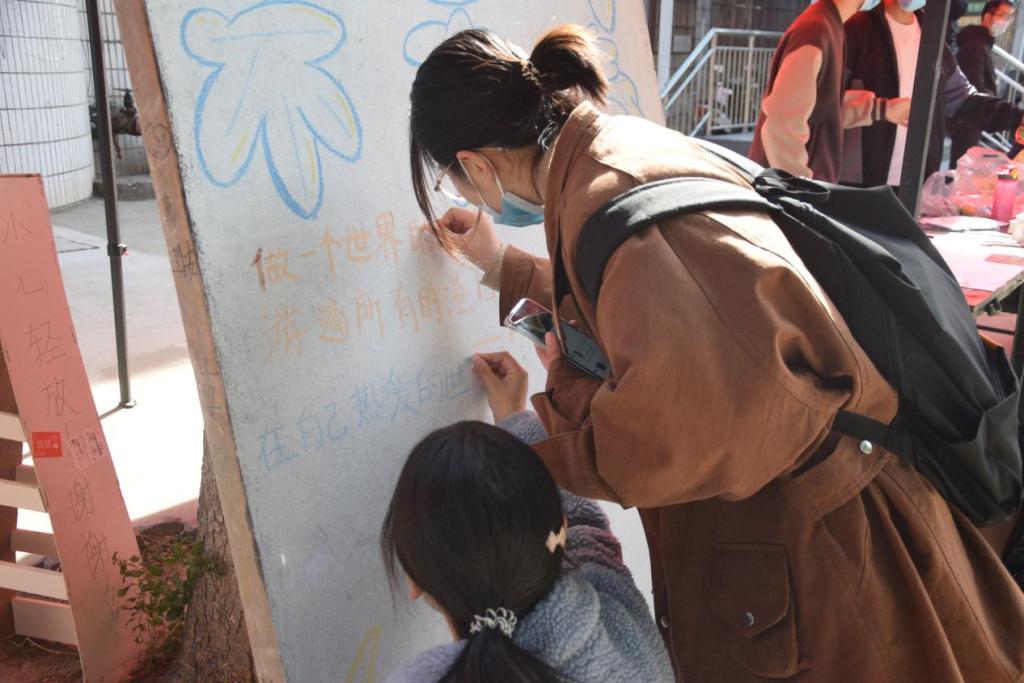 活动期间,心理健康部成员在南苑餐厅门口搭起帐篷,每天安排成员定点值班,值班人员负责向同学们介绍本次活动目的及参与方式。心理健康部为参与活动的同学们准备好了笔和涂料,鼓励同学们通过书写青春,描绘梦想的方式,展现了自己独特的风采。在心理健康部成员们的带领下,同学们纷纷在黑板上写下了自己的宣言、签下自己的姓名,以此来与自己的青春达成了一个约定。最后,同学们通过以画笔来描绘青春时光,以手印来临摹美好未来的方式,展现了属于自己的青春风采。