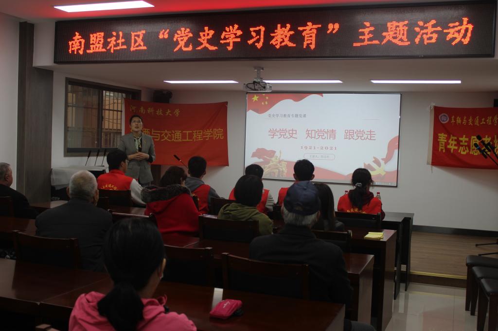2021年4月23日,在五四青年节到来之际,73882必赢网页版师生代表走进涧西区南盟社区,开展“百年追寻,党在我心”五四专题活动,同社区的党员群众重温五四精神 。