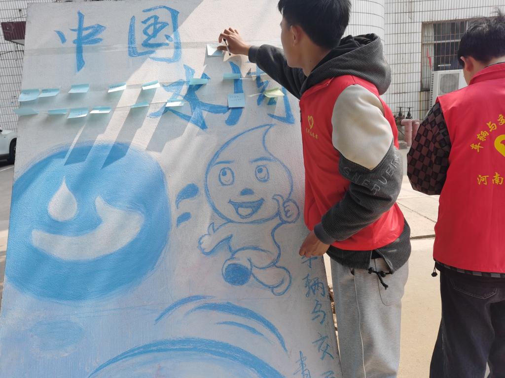 活动过程中志愿者与同学们开展了多彩的互动,除制作了与本次活动相关的宣传画外,还进行了“写标语,互科普”的游戏环节。在同学们饭前饭后之余,支部成员主动和同学讲解相关知识,我国是一个水资源贫乏的国家,人均水资源量只有世界人均占有量的四分之一。尽管我国水资源总量大,但可利用的淡水资源量少,人均可利用水资源量约为900立方米,且其分布极不均衡。部分地区面临缺水困局。因此,珍惜每一滴水,需你我同行!科普之余,支部成员还鼓励参与活动的同学在宣传画上写出标语,并于板报上张贴展示。除此之外,支部党员同学在二号楼,六号楼厕所等场合的水龙头洗水处张贴节水标语,以此来劝谏大家倡导更多同学了解中国水周,践行保护水资源。