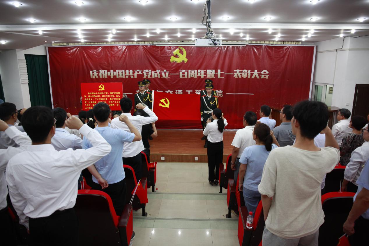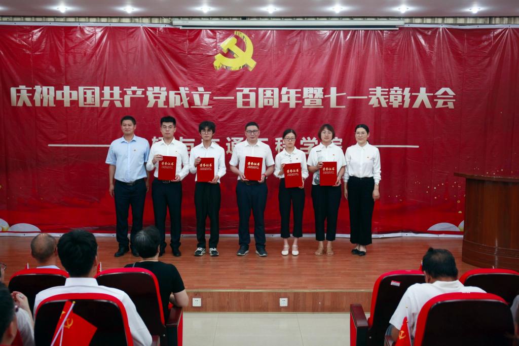 院长徐立友宣读学院党委表彰决定;与会领导分别为优秀党员、优秀党务工作者和先进党支部代表颁发了荣誉证书;党玉功老师和郭占正老师分别代表优秀党员和先进党支部作了发言;院党委委员为新入党的预备党员代表佩戴了党徽;院党委书记田志红带领与会全体党员重温了入党誓词。