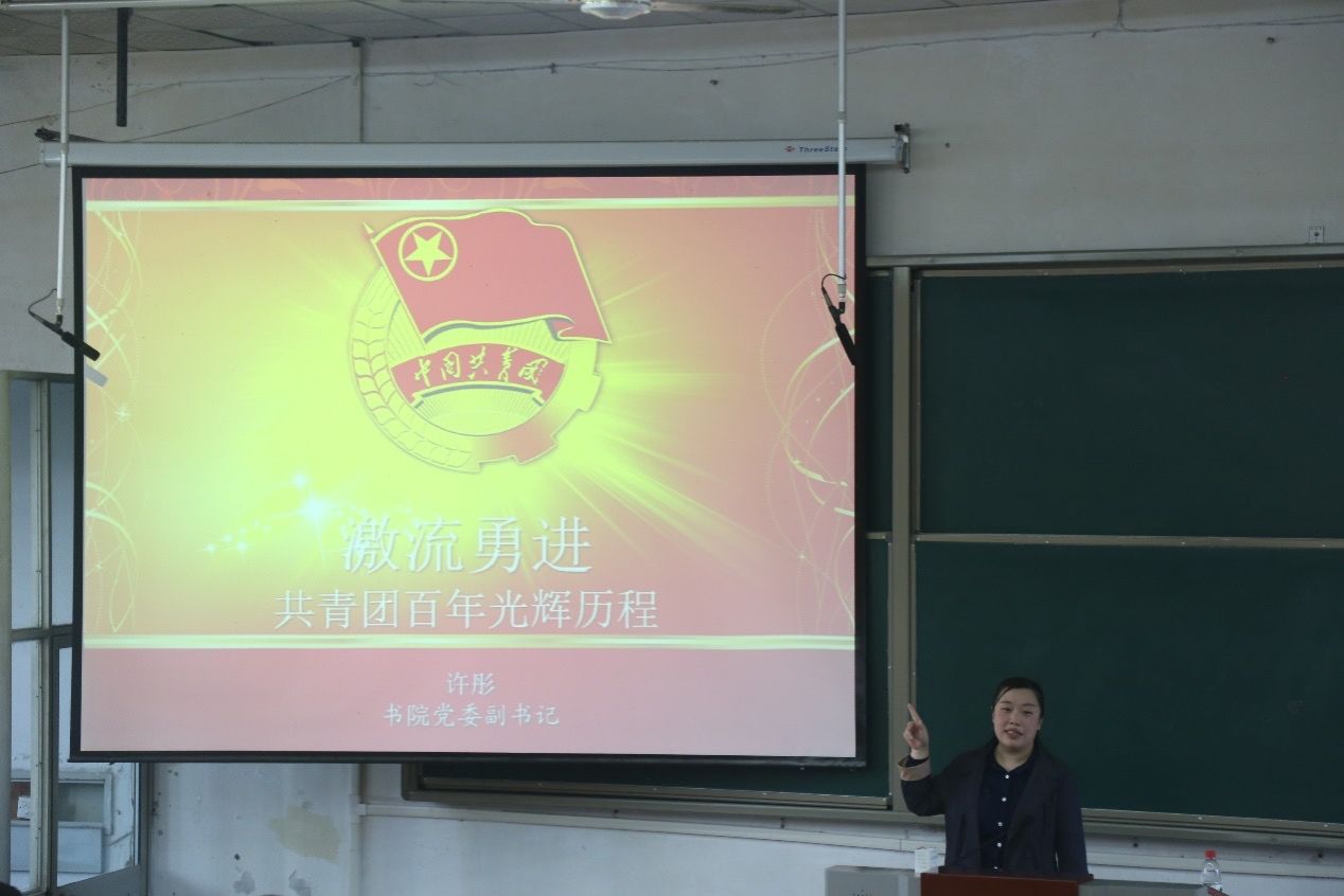 许彤首先为同学们详细介绍了共青团的百年团史。她指出,百年来,共青团走过了光辉的历程,我们的团一直都肩负起了历史使命,坚决地完成了党交给我们的任务。随后,许彤通过具体事例向同学说明了作为学院团学骨干,要学思悟并举,深入学习百年团史,牢记使命,坚定自己的理想信念,并对自己的大学进行规划。最后,许彤告诫同学们要努力学习科学文化知识,将个人梦与中国梦结合起来,为祖国的发展贡献自己的力量,在现代化建设中彰显青年担当。