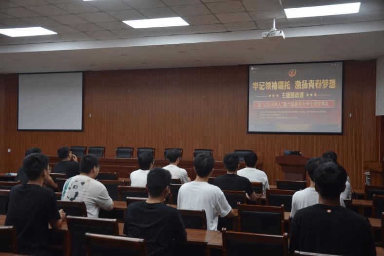 6月25日晚,73882必赢网页版在6号楼101会议室组织收看“牢记领袖嘱托,激扬青春梦想”主题思政课暨出彩河南人第六届最美大学生颁奖典礼。各年级学生代表90人现场观看,其他学生线上观看。