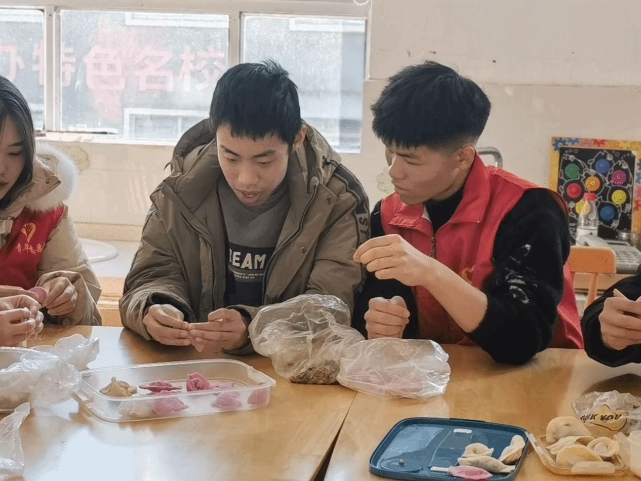 志愿者们抵达金雨点启智中心后,亲自示范如何将馅料放在饺子皮上,教自闭症患者们包饺子。志愿者们耐心地为自闭症患者讲解包饺子的技巧与步骤,自闭症患者纷纷围在桌旁,认真倾听并动手实践。最后,经过大家的努力,呈现出一盘盘形态各异的饺子。