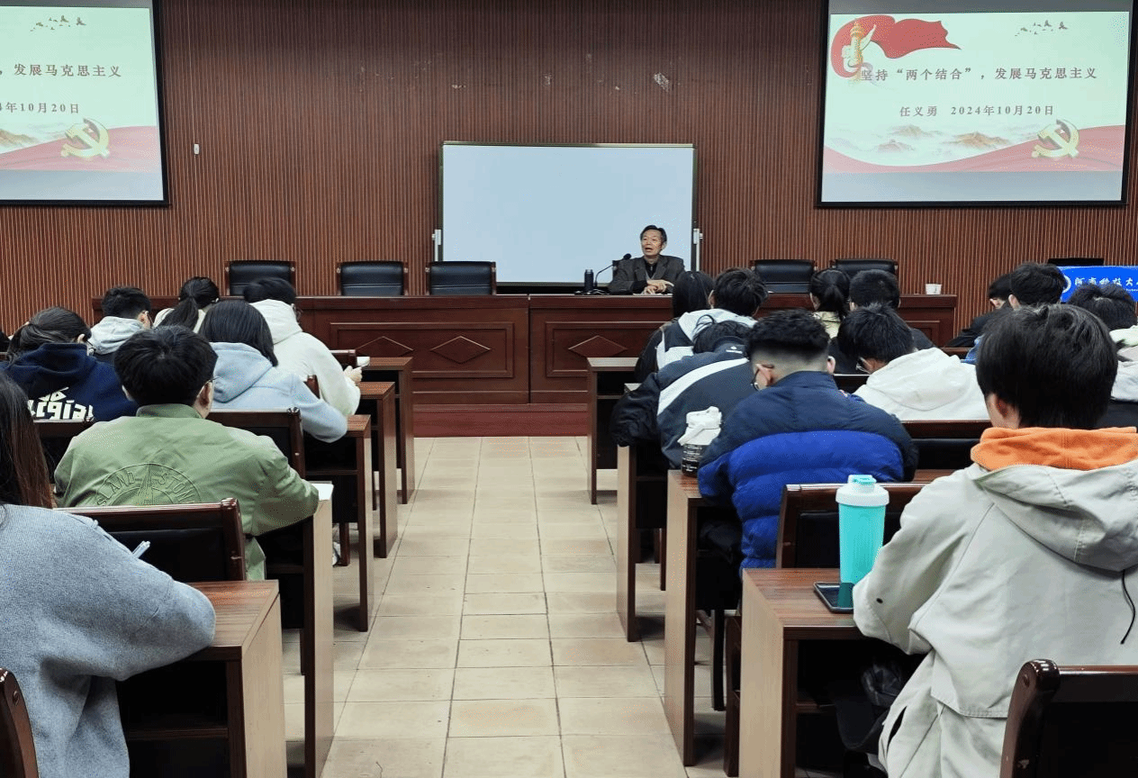 10月20日上午,73882必赢网页版在西苑校区6号楼101会议室举办“坚持‘两个结合’,发展马克思主义”专题讲座。本次讲座特邀学院原党委书记、现校关工委宣讲团成员任义勇主讲,学院团委副书记李艳红主持,第44期全体入党积极分子参加。