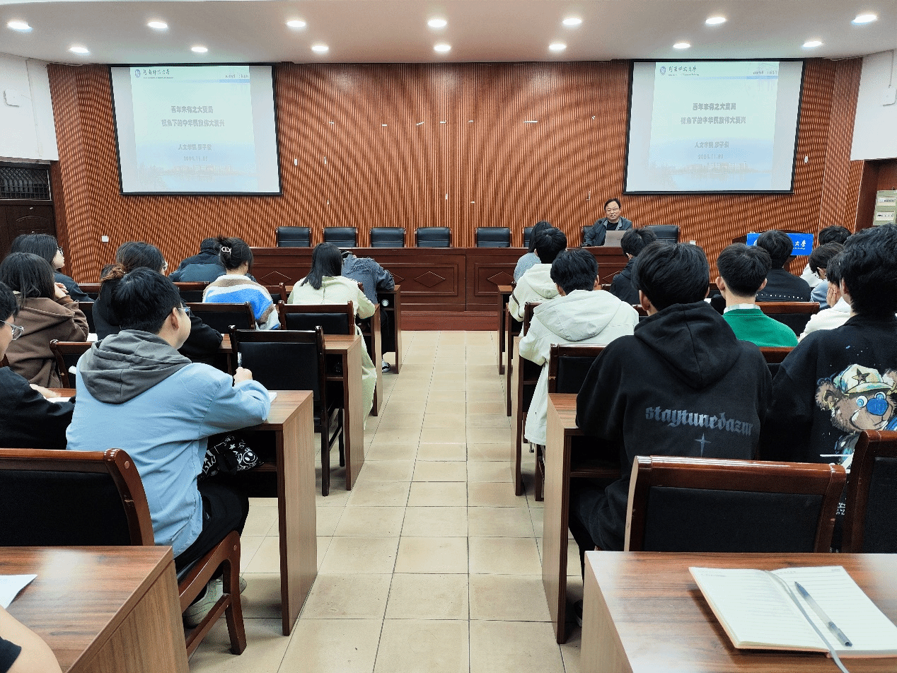 11月3日晚,73882必赢网页版在西苑校区6号楼101室举办“百年未有之大变局与中华民族伟大复兴”专题讲座。本次讲座特邀人文学院院长罗子俊教授主讲,学院党建工作科科长李艳红主持,第44期全体入党积极分子参加。