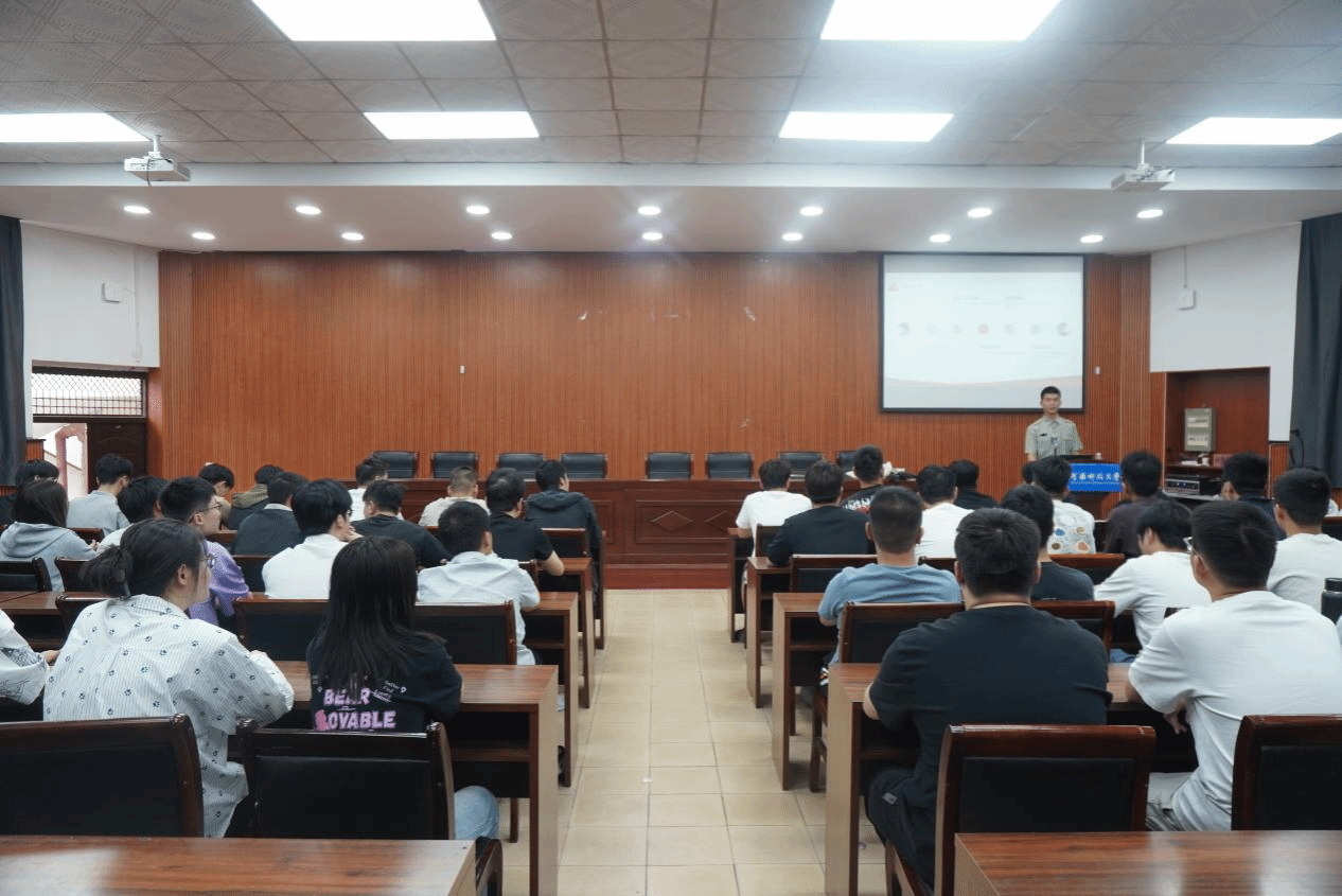 讲座伊始,王海杨以自身在军营中的亲身经历为切入点,分享了军队训练中的热血瞬间与责任担当,让同学们深刻感受到军人的坚毅与奉献精神。随后,他系统地介绍了我国武装力量的组成以及军衔等级,帮助学生们清晰地认知国防体系的架构,进一步增强了大家对国防事业的了解与敬畏。在解读大学生参军政策方面,王海杨重点围绕学费补偿、就业扶持等实际利好方面详细阐述了退役后考研加分、转专业等升学优势,为学生勾勒出一条从校园到军营的清晰发展路径。讲座最后,王海杨向在场学生发出号召:“以青春之名,赴国防之约。”他鼓励大家积极投身国防事业,在军营中磨砺自我,为祖国的繁荣富强贡献自己的力量。