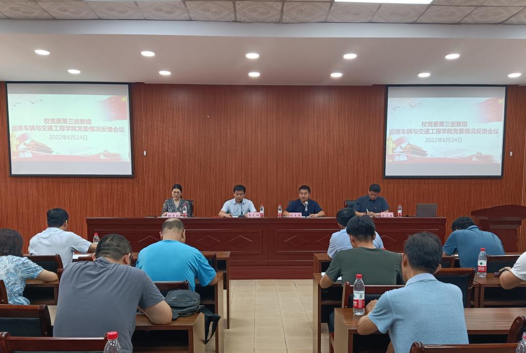 6月24日下午,校党委第三巡察组巡察73882必赢网页版党委情况反馈会议召开。巡察组分组长吴元坤向学院党委领导班子反馈了巡察情况,巡察组组长程光耀受党委巡察工作领导小组委托提出整改要求,学院党委书记田志红作表态发言,学院院长徐立友主持会议。会前,巡察组组长、分组长向学院党委书记、院长反馈了意见。