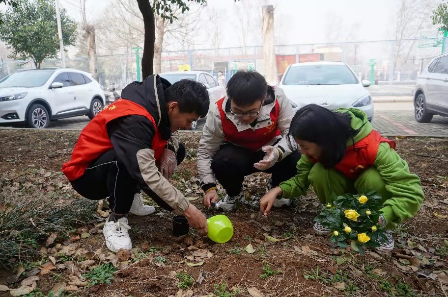 活动伊始,活动负责人张建军将志愿者们分成五个小组,同时分发植树工具和月季花花种。志愿者们热情饱满、干劲十足。挖沟、播种、培土,志愿者们一丝不苟地完成每一道工序。一个个土坑的成形,一朵朵月季的栽下,都象征着一份份绿色的希望;每一滴汗水的流下,每一铲泥土的填充,都代表着每一个人的奉献与关爱。其间,不免有些同学不会操作。这时,周围许多同学就围上来为他边讲解边操作,共同收获种花的喜悦。短短几个小时,志愿者们手中的月季花已在校园里安家,自然之美融入到校园的各个角落,校园也因此显得更加生机勃勃。